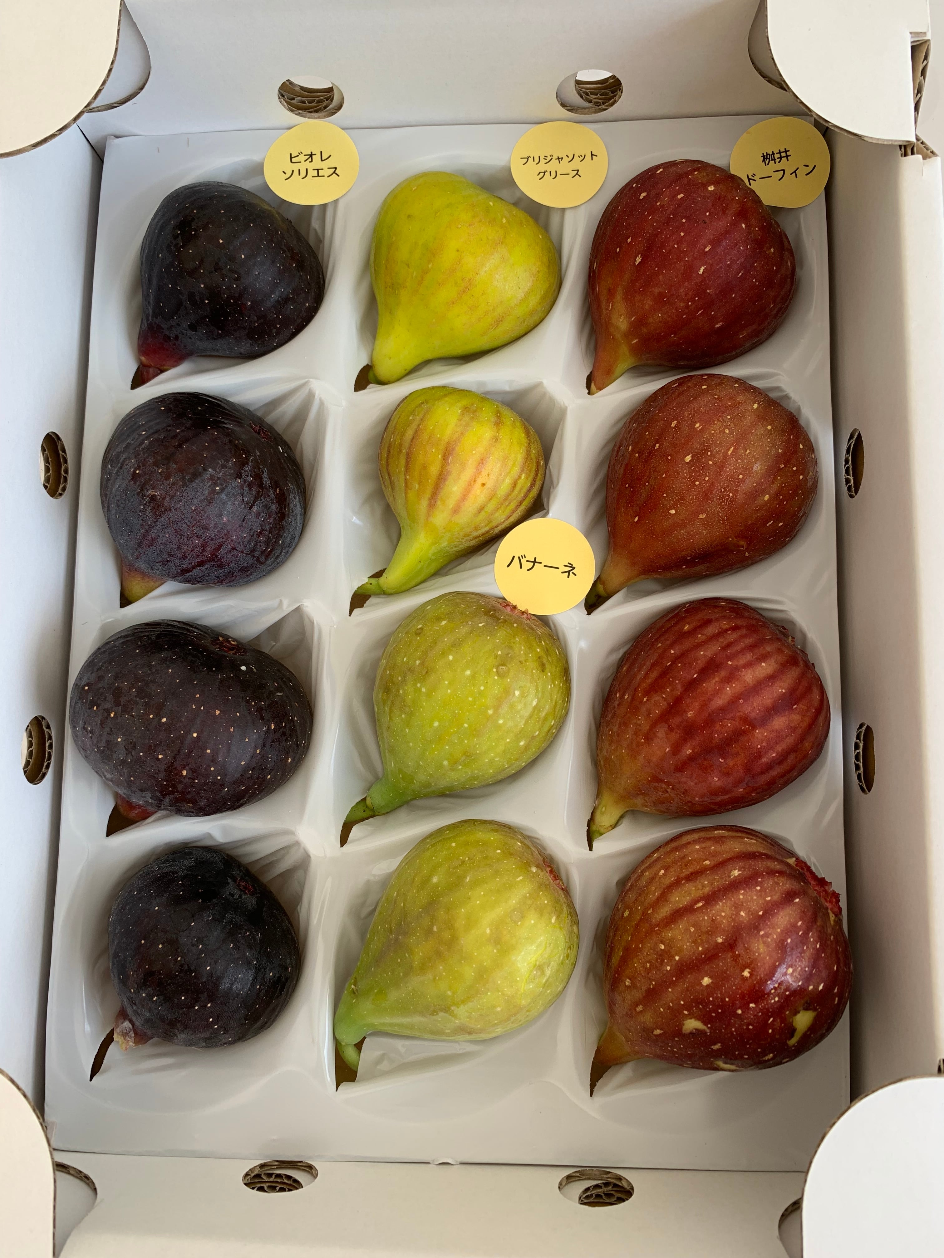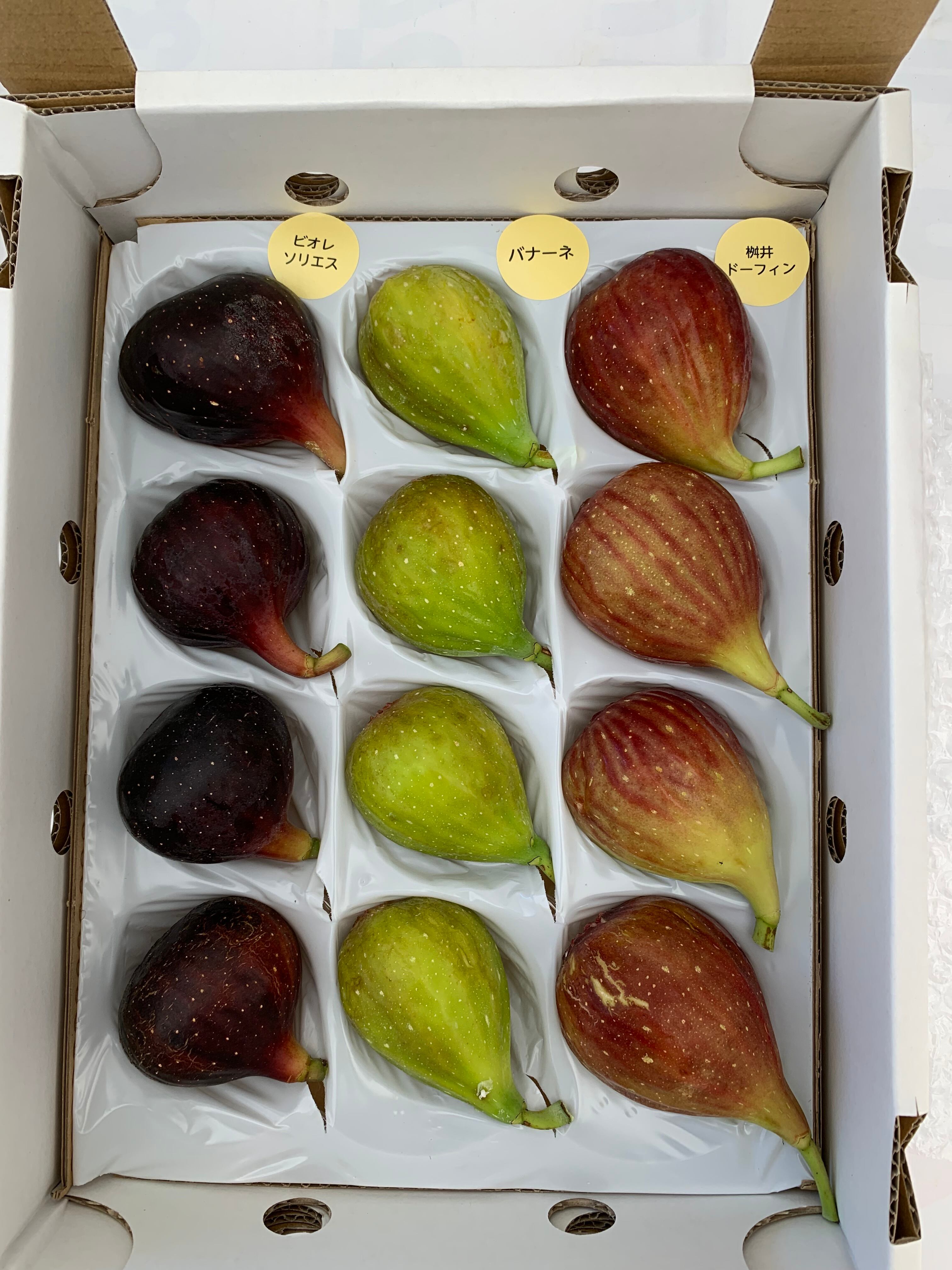 特別な贈り物にぴったりな、贈答用いちじくの詰め合わせをお届けいたします!桝井ドーフィン、ビオレソリエス、バナーネ、ブリジャソットグリース、蓬莱柿のいずれかから選ばれた12個を、専用の箱「ゆりかーご」に丁寧に詰めて発送いたします。